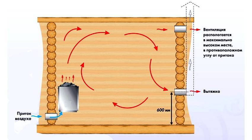 Но в ней необходимо поддерживать комфортную для приема процедур температуру, причем так, чтобы не образовывались сквозняки, и не было резкого перепада от жары на полке до холода на полу. Для этого воздушные потоки должны двигаться по определенной траектории, которую задают посредством размещения приточных и вытяжных отверстий в конкретных местах.