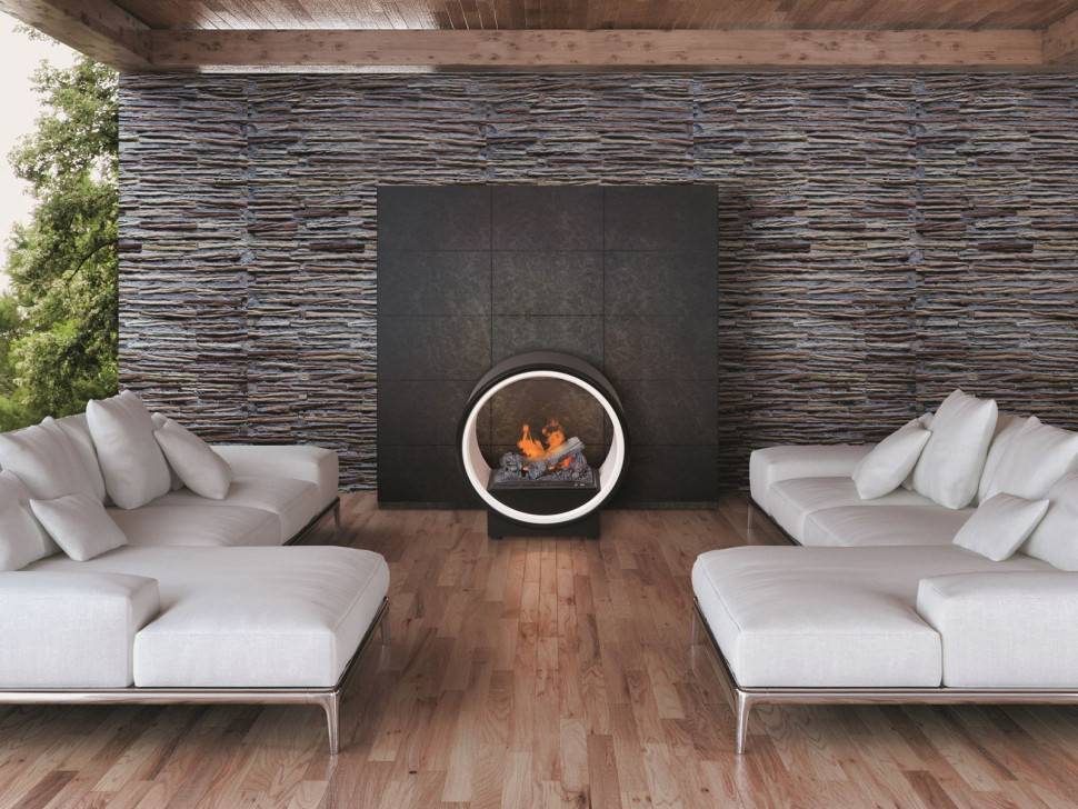 Отличной идеей для хай-тека станет подвесной биокамин в интерьере, расположенный на фоне панорамных окон. Дополнит картину и придаст очагу реальности выложенный сланцем пол, который, кстати, весьма практичен, так как не боится ни грязи, ни острых каблучков.