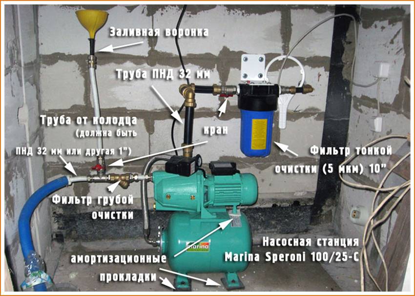 Для установки станции понадобится ровная площадка и укрытие от непогоды. Шланг поверхностного насоса опускают в скважину или колодец, гидробак подключают к водопроводной системе дома, а всю систему обеспечиваю электропитанием (понадобится УЗО).