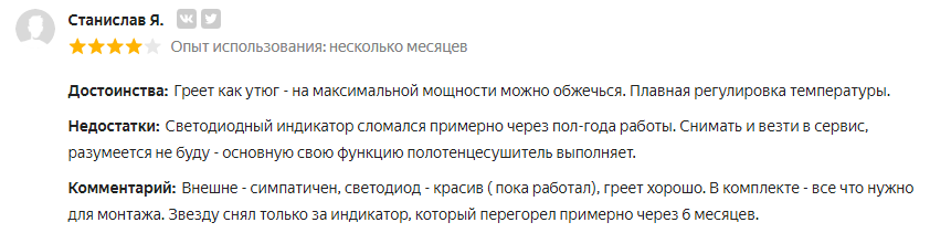 Как отмечают эксперты, отсутствие в комплекте кранов Маевского является серьезным недостатком. Претензий к работе полотенцесушителя у пользователей нет, греет хорошо, цена соответствует качеству.