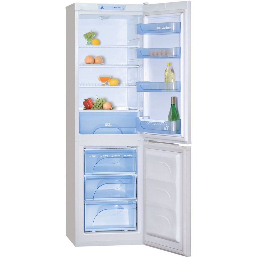 Ширина двухкамерной модели всего 48 см. Легко устанавливается в малогабаритную кухню. Объем камер 180 литров, что достаточно для семьи из 3 человек. Отличается низким электропотреблением – в год расходует около 245 кВт/ч. Из минусов – сильное обледенение морозилки. Для разморозки нужно отключать все устройство, так как морозилка находится внутри холодильного отделения. Хороший выбор для молодой семьи.