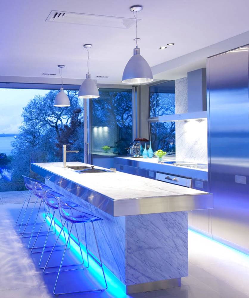 На кухне определите основные рабочие поверхности. Первая зона — резки и готовки. Вторая — обеденный стол. Дальше все зависит от планировки: возможно, у вас есть диван со столиком. Установите над каждой зоной по светильнику, а общий свет создайте со стен или с помощью закарнизной подсветки.