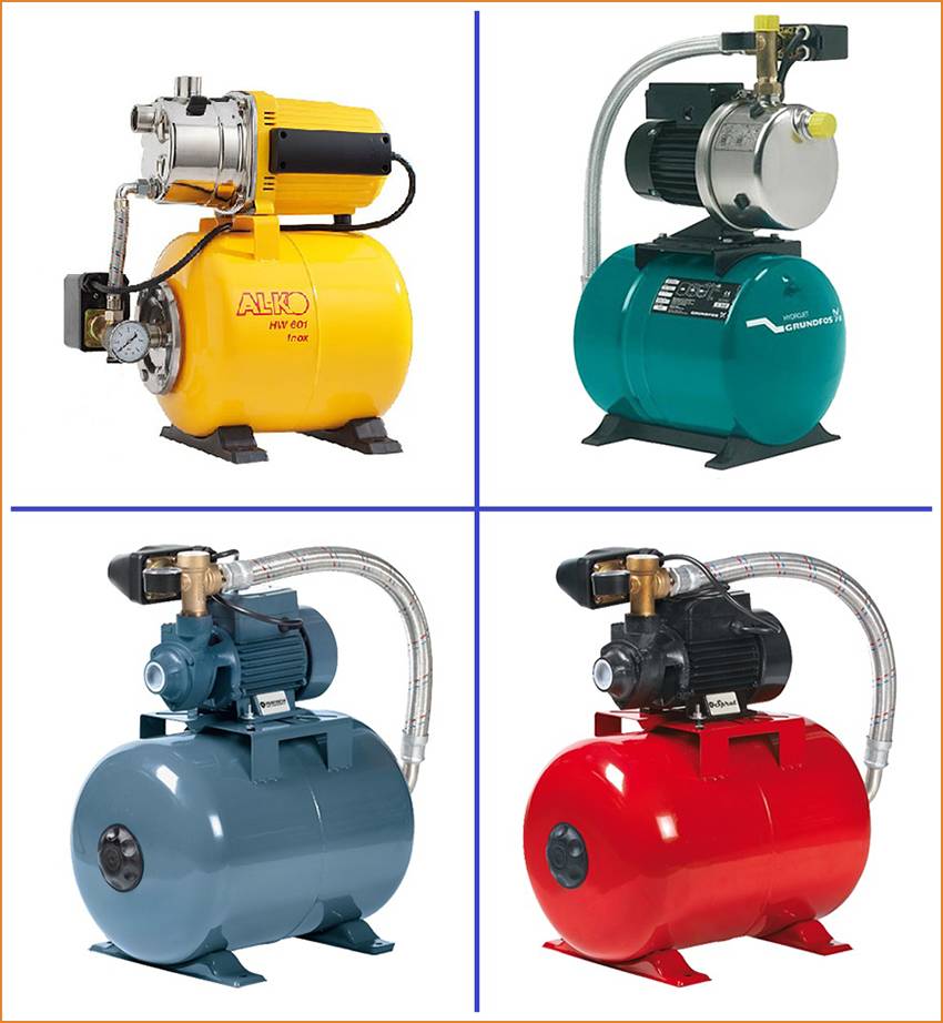 Отличаются компактностью и надёжностью, просты в монтаже, обеспечивают хороший напор воды. Но, из-за малой ёмкости аккумулятора, они не могут обеспечить долговременную подачу воды при проблемах с её источником.