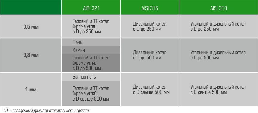 Таблица рекомендаций выбора марки и толщины стали в зависимости от отопительного агрегата и диаметра дымохода