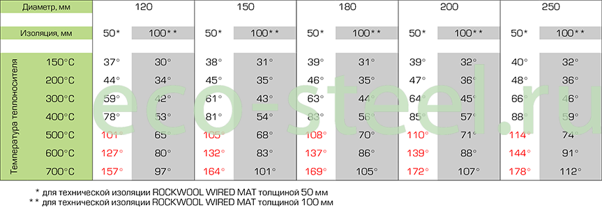 Таблица зависимости температуры на наружном контуре сэндвич дымохода от диаметра дымохода и температуры теплоносителя