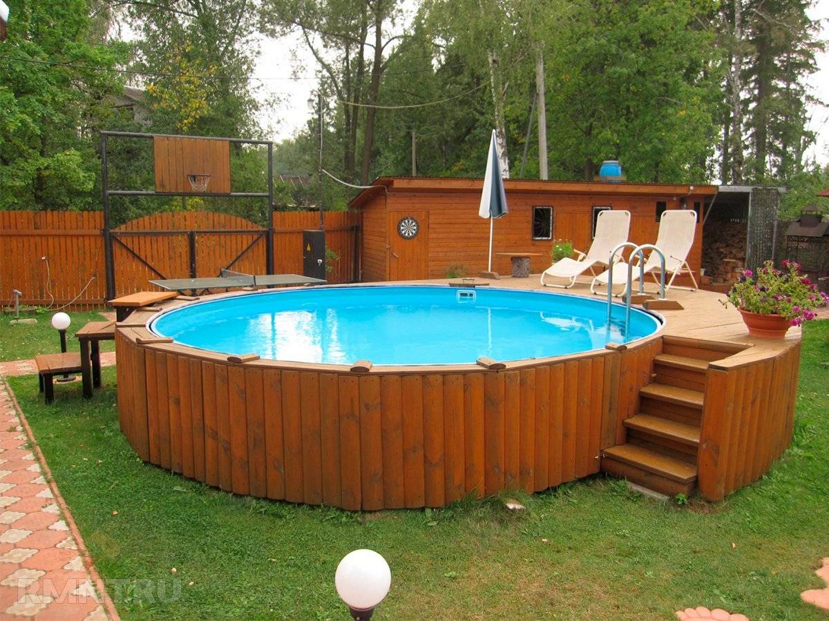 Деревянный каркас круглой формы более сложен в сборке и монтаже. Применяется специальная технология крепления, склеивания элементов, чтобы бассейн держал форму, вода не распирала стыки. Один из способов – углубление конструкции в грунт.