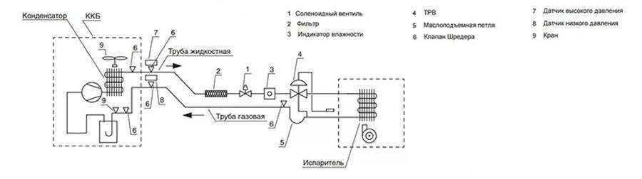 Также его элементами являются фильтр-осушитель, ТРВ, стекло смотровое. Последние три элемента находятся на межблочной жидкостной магистрали недалеко от испарителя.