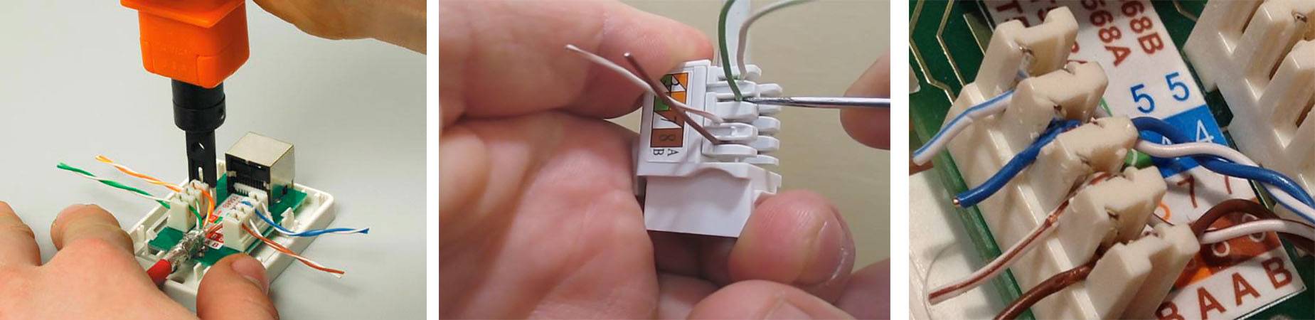 Пластиковая часть интернет-розетки прикручивается к стене — компьютерным разъёмом вниз, а кабельным входным отверстием наверх. Далее действия производятся в такой последовательности: