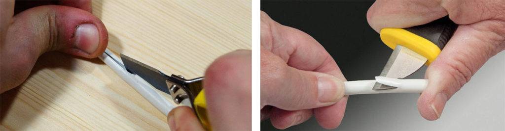 - После того, как все проводники надежно встали на свои места, лишние ненужные кусочки удаляются с помощью ножа или ножниц. Можно использовать кусачки.