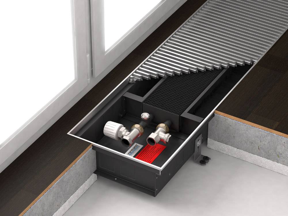- Во внутрипольном – такие конвекторы лучше всего справляются с предотвращением оседания конденсата на панорамных окнах.
