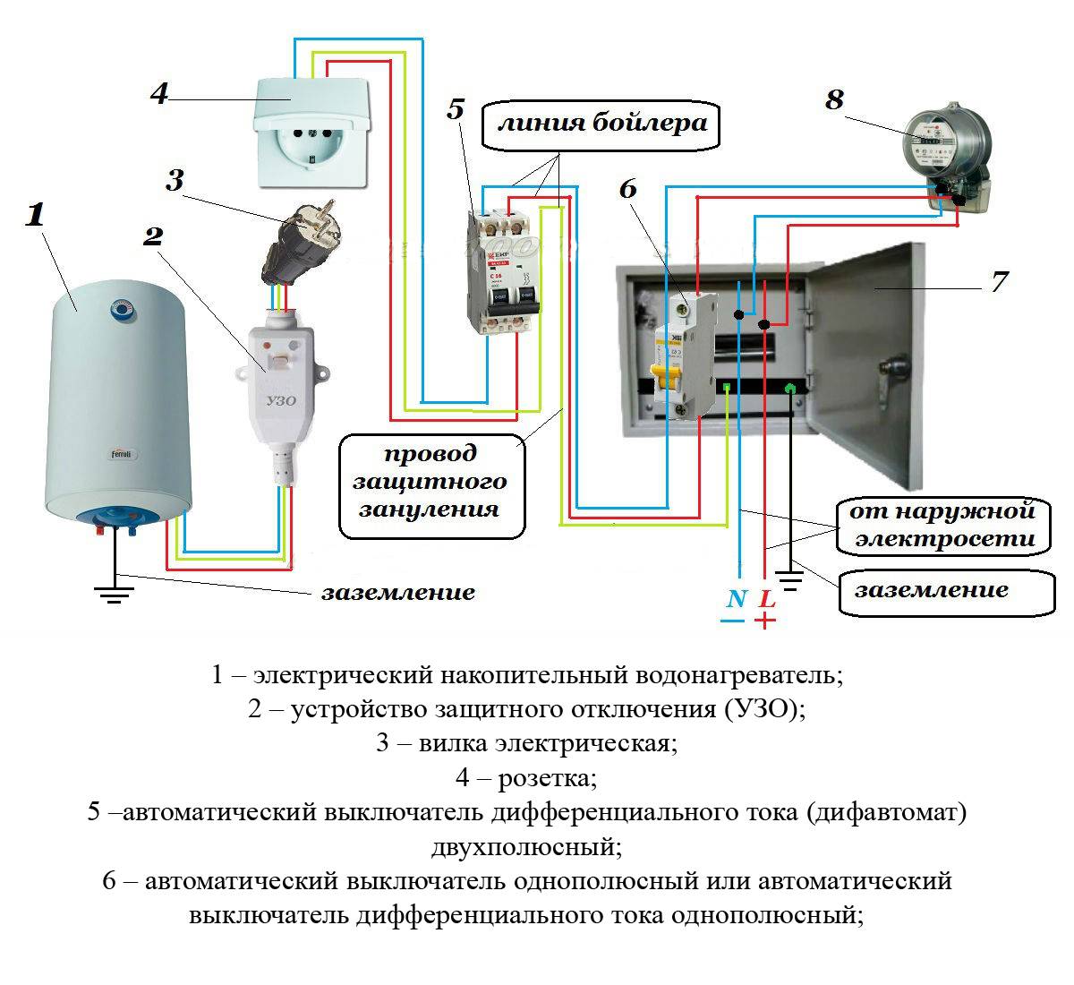 В схеме подключения водонагревателя к электросети, УЗО играет роль защиты человека от поражения электрическим током, но при этом заземление водонагревателя будет хорошим дополнительным средством защиты. Однако устанавливать бойлер без заземления специалисты настоятельно не рекомендуют.