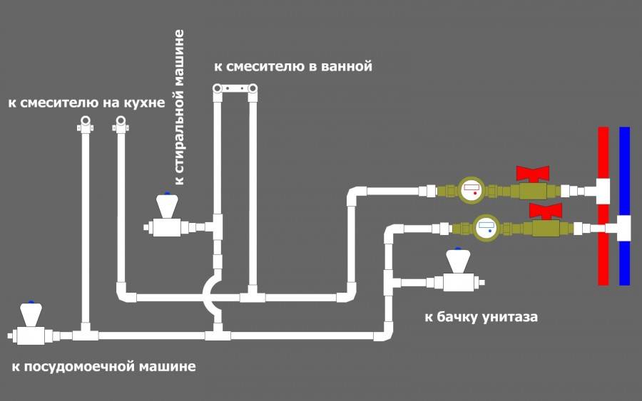 При составлении схемы не забудьте о необходимости установки кранов на магистрали: срезу после отвода еще в доме, и потом, на участке, перед первым ответвлением. Желательна установка кранов и дальше на магистрали: так можно будет в случае проблем отключить аварийный участок.