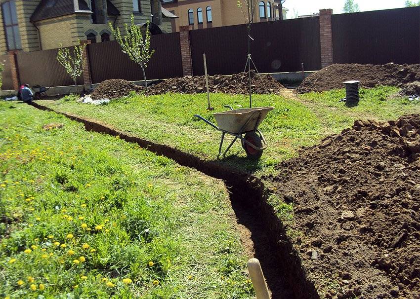 Следующим этапом является разметка будущей системы на участке: с рулеткой, колышками и верёвочками. Наметив прокладку трассы и установку пескоуловителя, колодцев и коллектора, приступают к земляным работам.