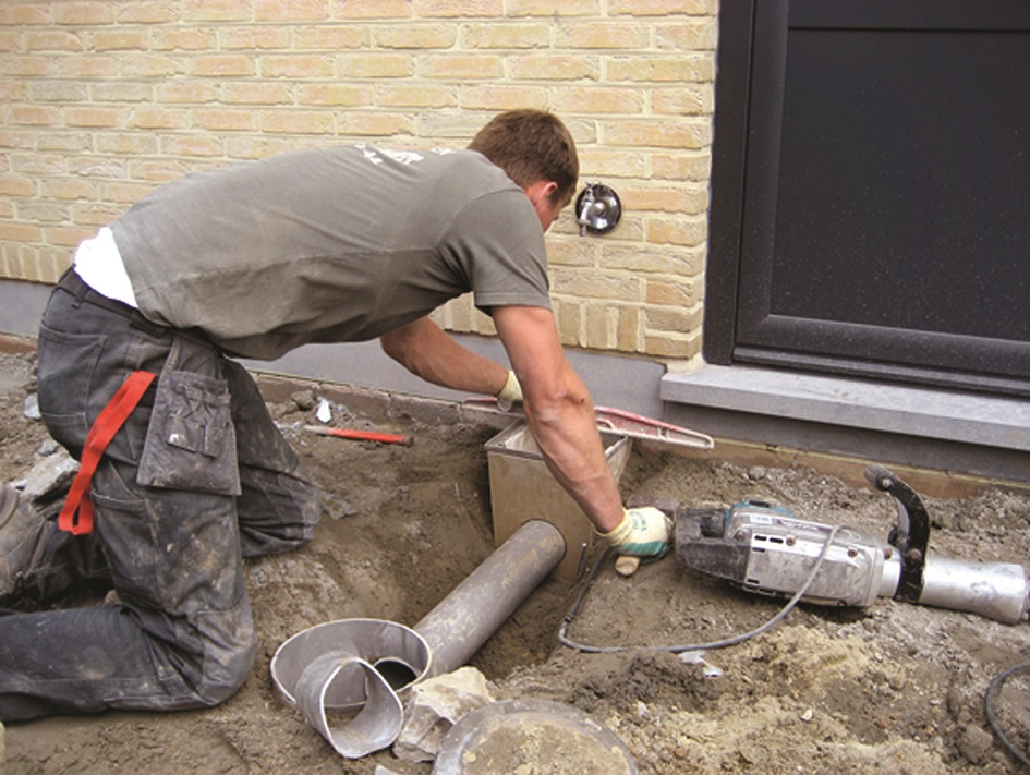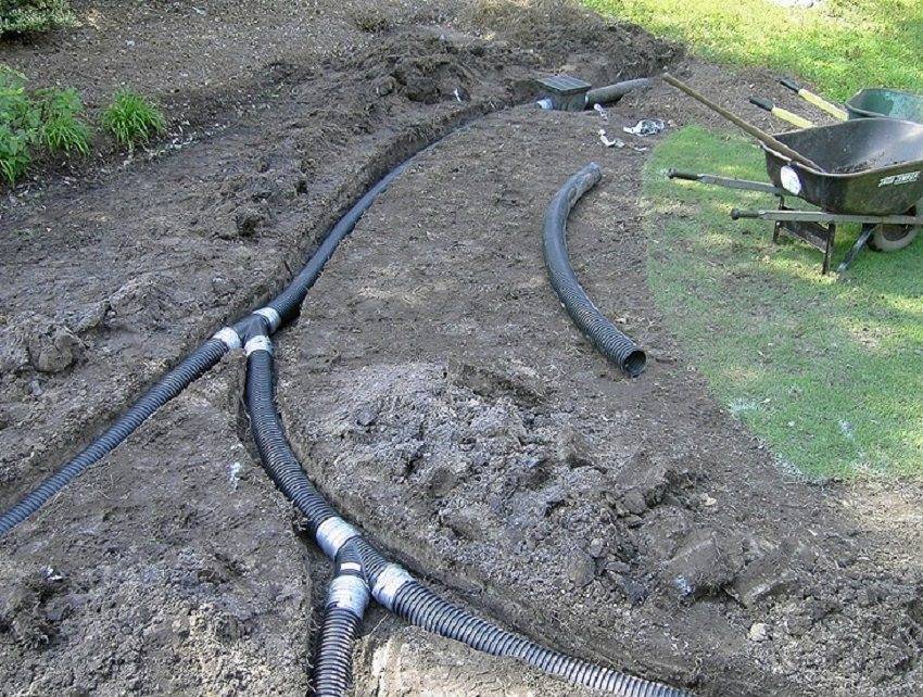 Монтируют дождеприёмники, к которым присоединяют колено под небольшим уклоном, и выполняют закрытую разводку труб с фитингами до коллектора или места сброса воды. Трубы закрытой разводки укладывают в выкопанные траншеи на песчаную подушку.