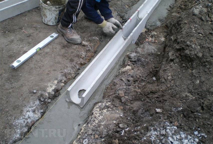 - положите на дно подушку из бетонного слоя. Высота — 8-10 см. Пока смесь не застыла, устанавливайте лотки;