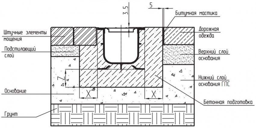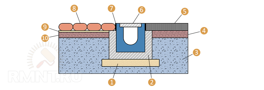 Схема укладки водоотводного лотка: 1 — песчаная подушка; 2 — бетонное основание; 3 — грунт; 4 — искусственное основание; 5 — асфальтобетонное покрытие; 6 — лоток водоотводный с решёткой; 7 — термошов (битум, герметик); 8 — тротуарная плитка; 9 — выравнивающий слой; 10 — основа