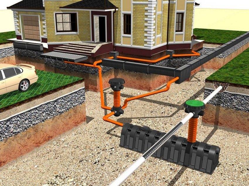 Это более сложный вариант устройства ливневой канализации закрытого типа, которую устраивают на больших участках с незначительными перепадами высоты. Помимо установки под водосточными трубами, точечные приемники устанавливают в местах, где надо организовать эффективный локальный отвод воды с поверхности. Например: