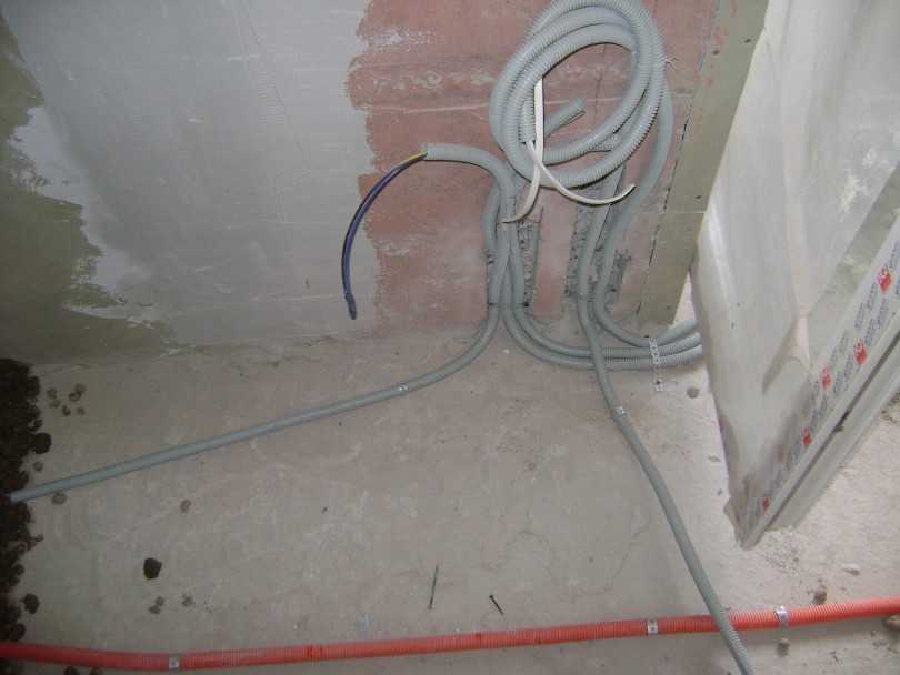 По полу прокладывается провод в специальной гофре, под заливку стяжки полов. Если уже есть заливка раствора, то делаются штробы, для гофры с проводом, с выходом на стену до распределительных коробок, далее до розеток и выключателей.