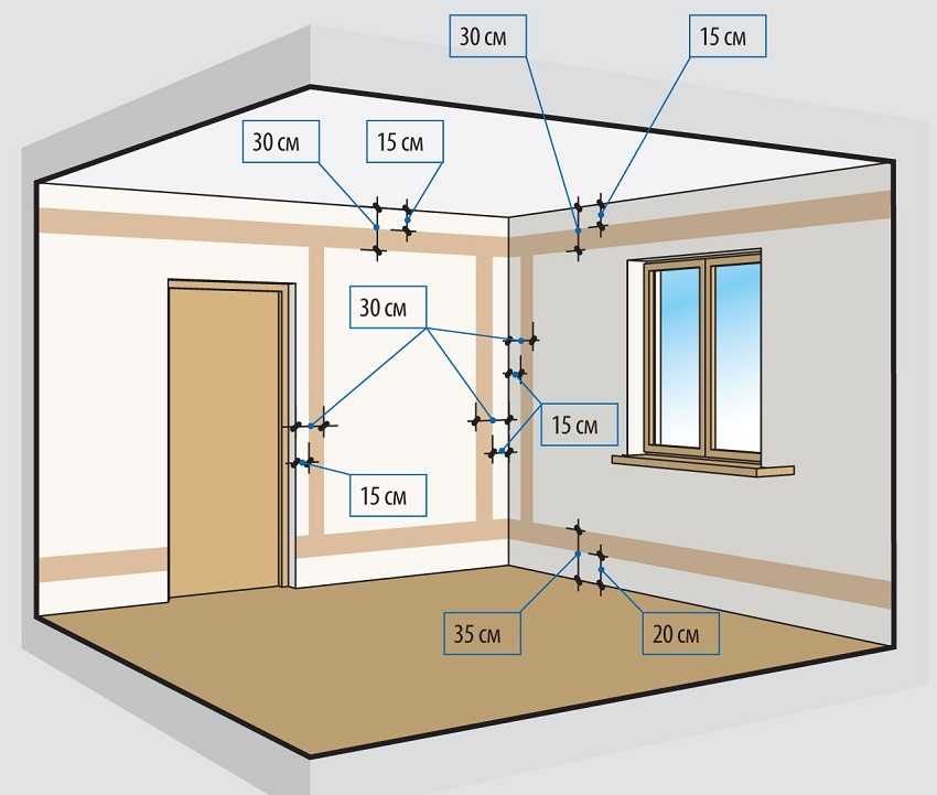 При разметке нужно обязательно соблюдать нормативные расстояния между горизонтальной проводкой и потолком (не менее 10.5 см от потолка) и между плинтусами (не менее 15-20 см). Проводка, расположенная вертикально, должна располагаться на расстоянии 10 см от оконных и дверных проемов.