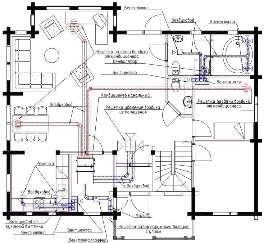 Схема вентиляции в частном доме своими руками должна предусматривать не только отвод, но и приток воздуха в достаточном количестве. Если не позаботиться об этом, то можно считать, что в доме нет правильной вентиляции. Герметичность окон и дверей становится причиной того, что в доме перестает функционировать естественная вентиляция и наблюдается процесс застоя воздуха. Кроме того, работа принудительного воздухообмена приведет к обратному эффекту, когда через каналы естественной вытяжки воздух начнет двигаться в обратном направлении вместе со всеми пыльными накоплениями.