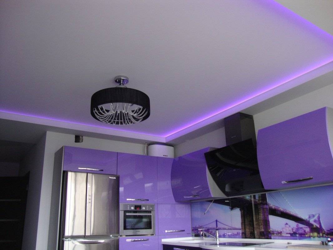 Подобные потолки с подсветкой будут привлекать к себе особое внимание, придадут кухне больше уюта –нужно лишь подобрать рисунок, продумать, как будут располагаться осветительные приборы, выбрать нужный цвет подсветки и заново присмотреться к своей маленькой, но такой уютной кухне