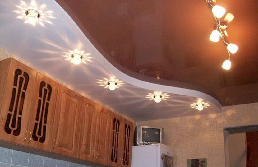 Есть такие варианты освещения на кухне с натяжными потолками: