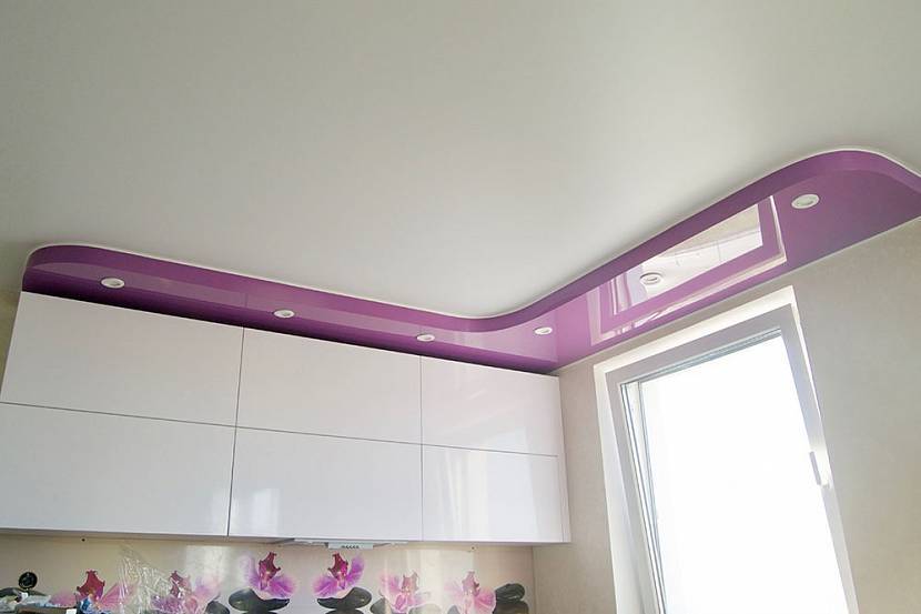 Если потолки на кухне высокие, вы вполне можете позволить себе двухуровневую конструкцию из матовых и глянцевых, тканевых и ПВХ- полотен.