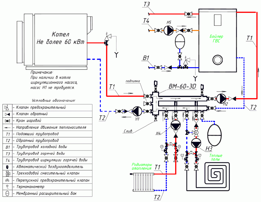 Следует отметить, что циркуляционный насос котла (встроенный в агрегат или установленный отдельно) обычно не гарантирует обеспечения качественной циркуляции теплоносителя в системе с большим числом потребителей – поэтому каждый блок потребления обычно оснащается независимым насосом (узел теплых полов – в обязательном порядке, БКН – в соответствии со схемой подключения).