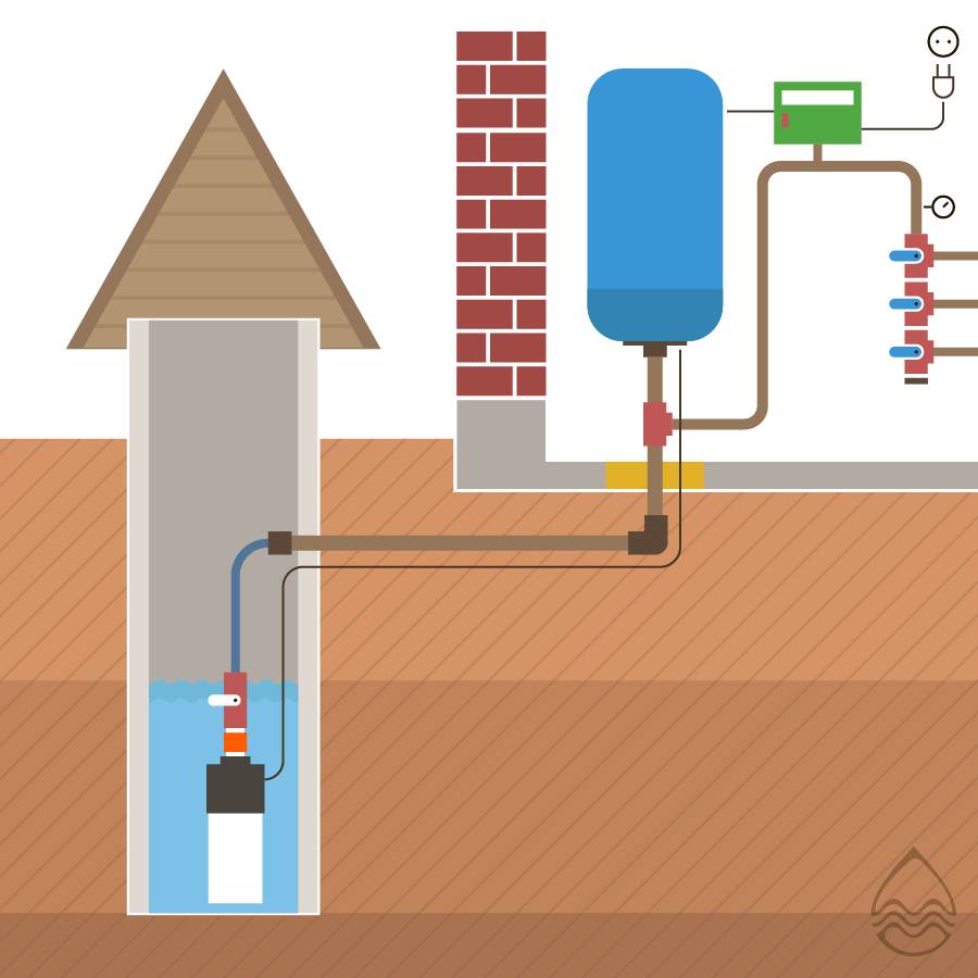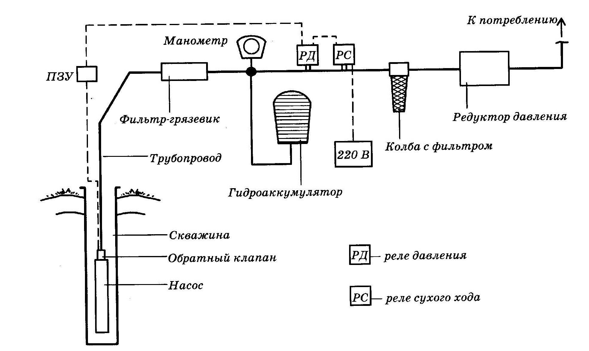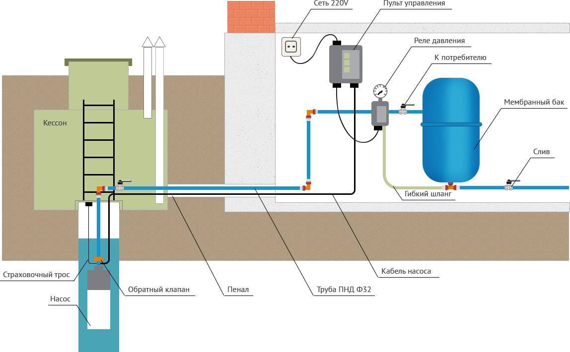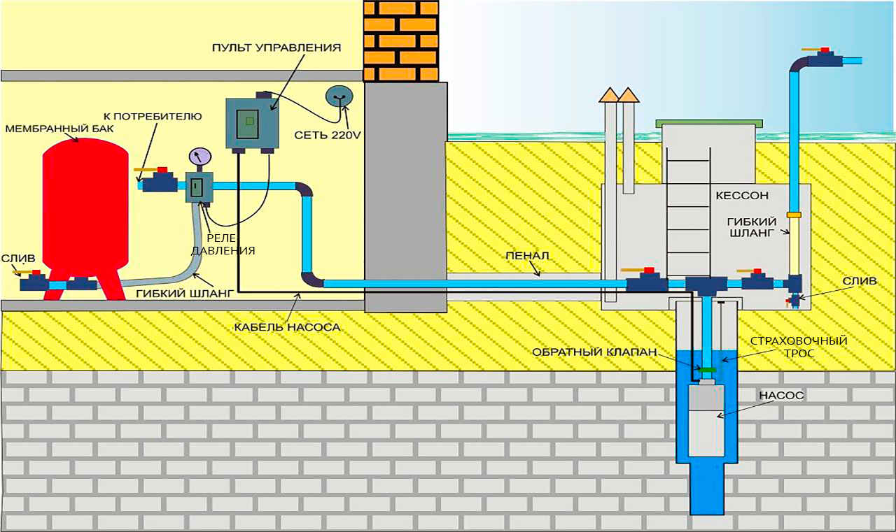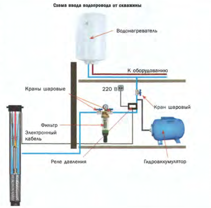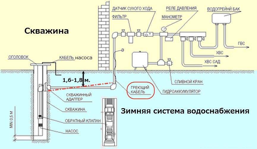 При обустройстве автономной системы водоснабжения загородного дома требуется защитить наружный трубопровод от зимних морозов. Участок трубы от колодца или скважины до точки входа в здание необходимо заглубить в грунт ниже уровня промерзания. Дополнительно следует уложить греющий кабель, чтобы защитить трубопровод от замерзания в сильные морозы.