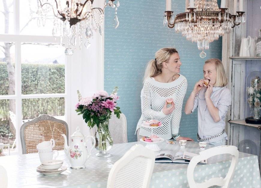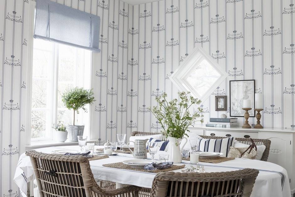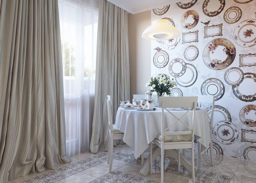 Обои в провансальском стиле, как и другие элементы композиции, имеют яркие, приглушенные цвета и тонкие узоры. Главную роль играют белые, иногда разбавленные пастельными оттенками желтого, синего и розового.