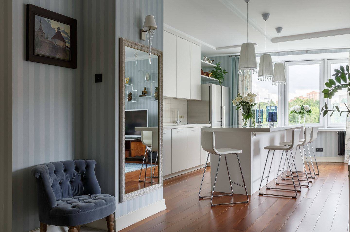 Востребованным будет фотодекор и в квартире-студии, где кухня совмещена с гостиной. Фотоизображение создаст необычный визуальный эффект, параллельно зонируя кухонную территорию.