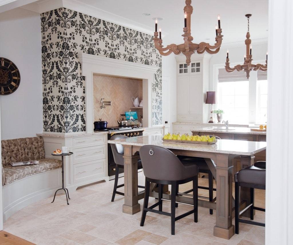 фотообои с рисунком старинной гравюры в интерьере классической кухни