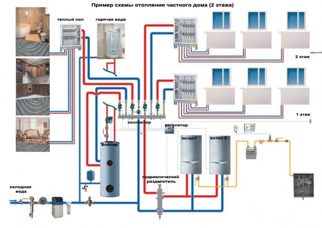 Если система теплоснабжения сложная, имеет поэтажную разбивку и разные виды отопления – радиаторное и «теплый пол», потребуется создать отдельные температурные контуры и завязать их через гидравлические коллекторы на подаче и обратке. Профессионалы рекомендуют для установки в такой системе применять усредненные значения диаметров труб — 20х3,4.