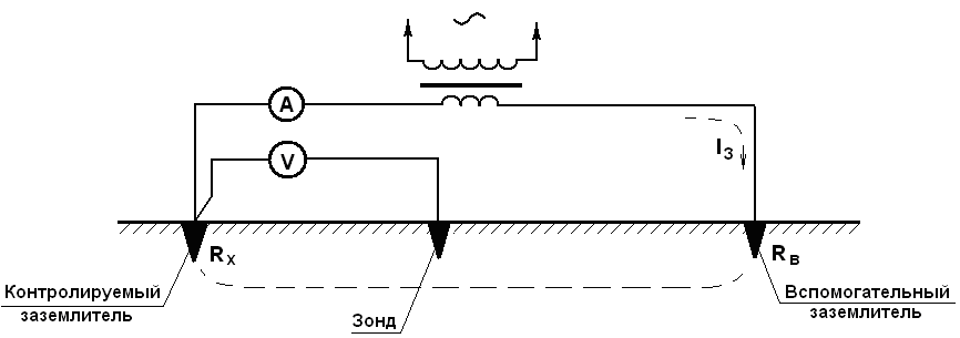 Замеры сопротивления заземлителей чаще всего производятся методом амперметра-вольтметра. Для непосредственного измерения выполняется сборка специальной электрической цепи с проверяемым заземлителем и вспомогательным токовым электродом. Схема дополняется потенциальным электродом, принимающим участие в замерах падения напряжения во время течения электрического тока по заземлителю. Потенциальный электрод располагается в той же зоне, что и нулевой потенциал на расстоянии, одинаковом от токового электрода и заземлителя.