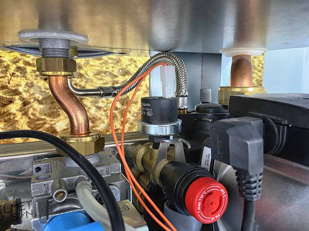 - осмотреть ограничитель температуры теплообменника устройства и убедиться, что жила цела, при необходимости – заменить провод или зачистить его, плотно присоединив обратно;