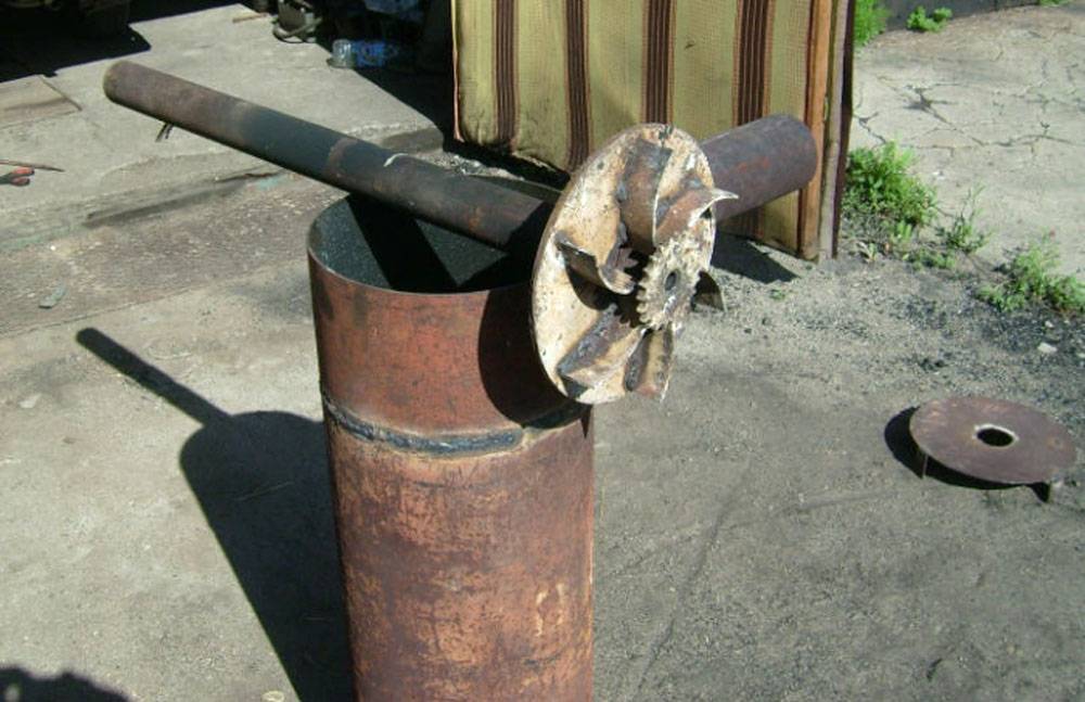 - Изготовьте поршень. Сделайте диск с отверстием, приварите воздуховод и распределители из стальной полосы 40 х 4 мм или уголка 45 х 45 мм. Установите на торце трубы заслонку.