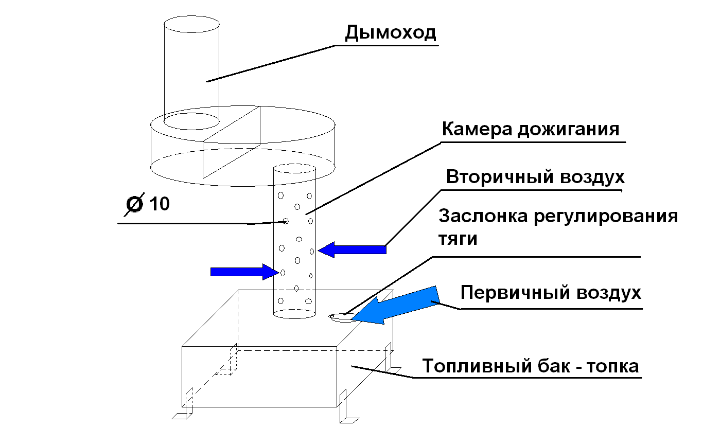 Принцип действия таков: топливо нужно разжечь с применением легковоспламеняющейся жидкости, после чего начнется испарение отработки и ее первичное горение, вызывающее пиролиз. Горючие газы, попадая в перфорированную трубу, вспыхивают от контакта с кислородным потоком и сжигаются окончательно. Интенсивность пламени в топливнике регулируется воздушной заслонкой.