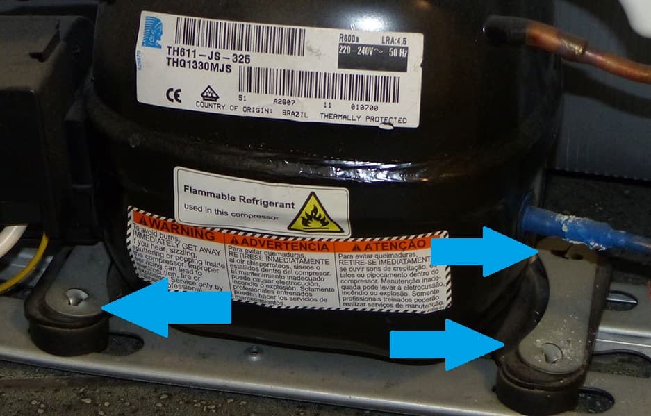 Часто бывает и наоборот – холодильник сильно шумит, если после установки вы не убрали транспортировочные болты компрессора (на картинке на них указывает стрелка). Это длинные болты Ø 12-16 мм, и они фиксируют компрессор при перевозке, чтобы он не порвал трубопровод и не повредил сам корпус. Здесь тоже все просто – уберите болты, проверьте прокладки или пружины на целостность.