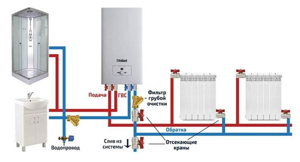 Двухконтурный котел подключается к системе отопления стандартно.Сложности не возникнуть, если следовать схеме ниже. Основной момент — правильно установить запорные вентили.