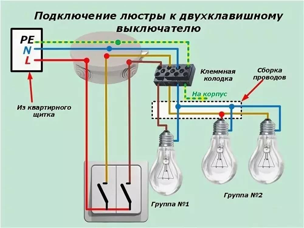 В принципе, подключение люстры через двухклавишный выключатель похоже на процесс ее подключения и через одноклавишный. Различие лишь в том, что фазные ламповые проводники делятся на 2 секции. И по одной скрутке от каждой ламповой группы подключаются (вместе) к ноль-проводнику. Оставшаяся пара скруток подсоединяется (по отдельности) к оставшейся паре проводов.