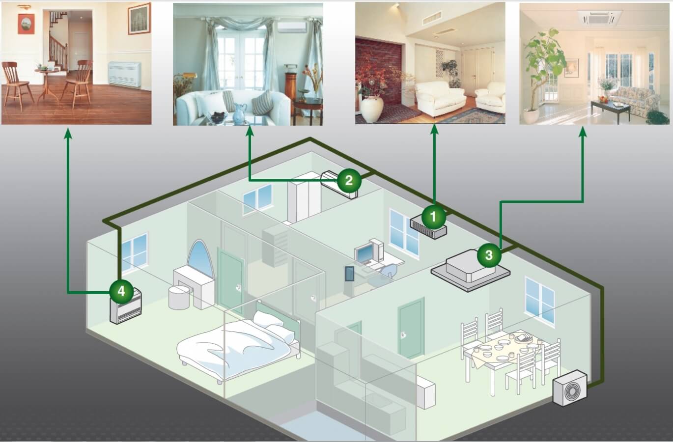 При такой системе охлаждения внутри помещения устанавливается от 2 до 7 самостоятельных блоков, в то время как снаружи располагается всего один. Такие приборы охлаждения идеально подходят для офисных помещений, многокомнатных квартир или небольших магазинов. Стоимость их несколько выше, нежели у привычных кондиционеров. Однако удобство эксплуатации нивелирует этот недостаток.