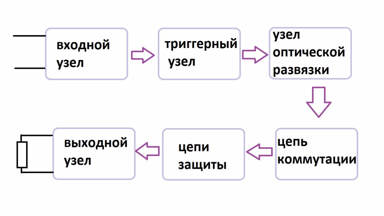 - Входной узел – используется для подачи управляющего сигнала. В состав узла входит токоограничивающий резистор и устройство для передачи сигнала на коммутирующий элемент.