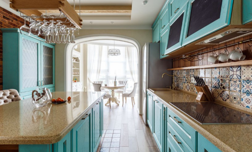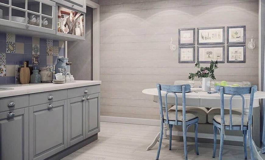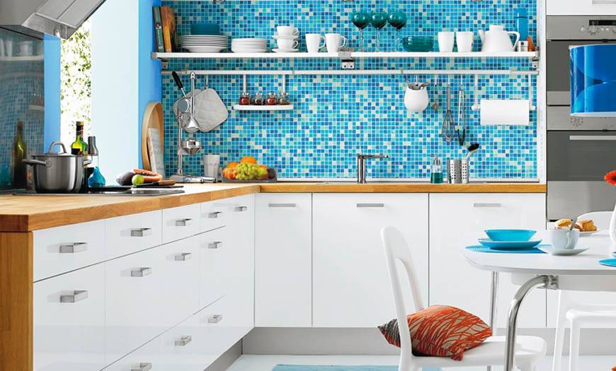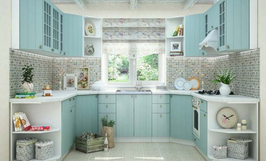 Можно окрасить стены в бежевый, песочный, любые оттенки синего, оформить фартук мозаичной плиткой, добавить мебель «под дерево» или универсальных серого или белого цветов.