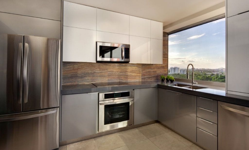Модерн вобрал в себя множество направлений. Изначально стиль характеризовали асимметрия, плавные линии и пастельные тона. Сейчас дизайнеры рекомендуют выбирать глянцевые покрытия, натуральные материалы для фасадов и столешниц, сочетать строгие формы и плавные изгибы.