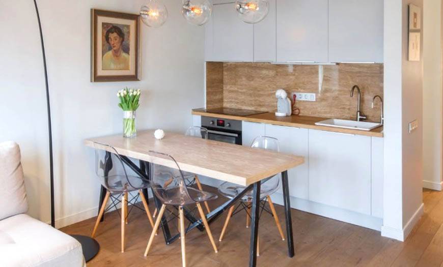В некоторых случаях не стоит пытаться совместить в маленькой кухне несколько функциональных зон – рабочую и обеденную. Иногда последнюю лучше вынести в другое помещение, особенно если есть возможность выполнить перепланировку и объединить кухню с гостиной или балконом.