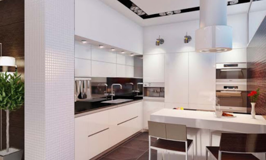 Хай-тек позволяет отказаться от излишеств без ущерба дизайну. Кухню в этом стиле характеризуют многофункциональная встроенная техника, глянцевые поверхности, большое количество точечных источников освещения. Стоит использовать нейтральные белый, серый, бежевый, черный, коричневый цвета и их оттенки.
