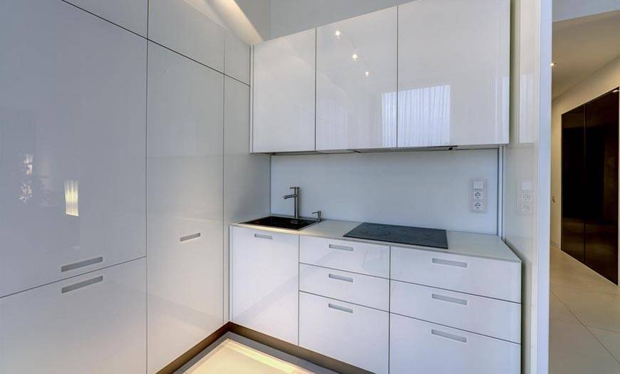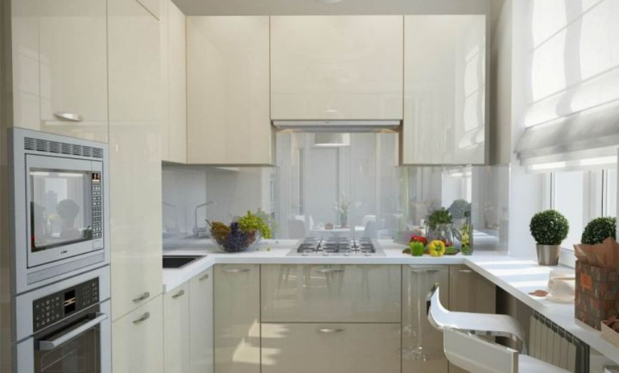 Гарнитур в маленькой кухне обязательно должен быть аккуратным, с закрытыми полками, без заметных рельефов.