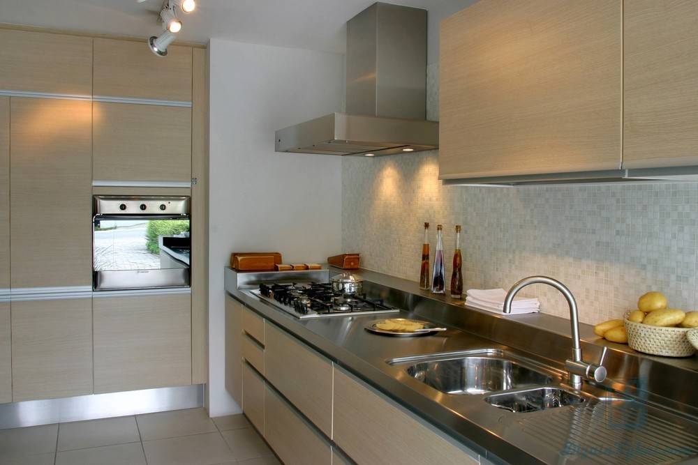 Конечно, для длинной кухни такое месторасположение будет не самым удобным — хозяйке придется много бегать вдоль рабочих мест.