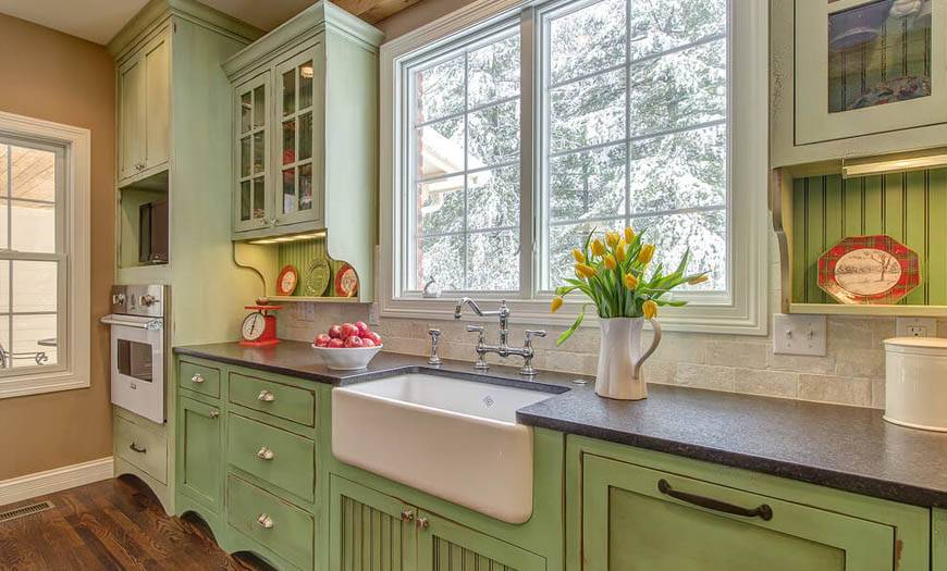 Важен декор: можно поставить на полки за дверцами со стеклянными вставками посуду ручной работы, повесить занавески из грубого льна.