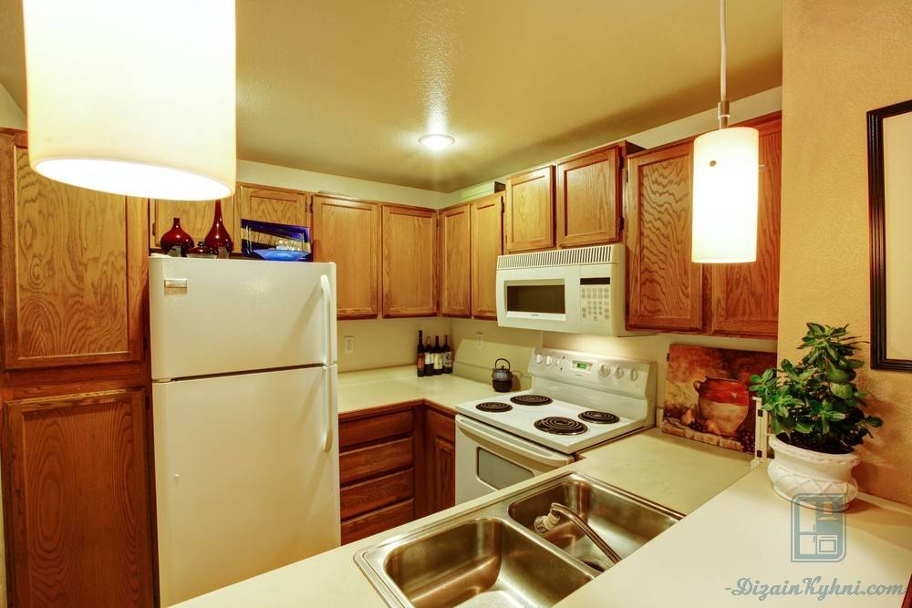 Чаще всего в маленьких кухнях выполняется строгая Г-образная расстановка мебели и крупной бытовой техники. Мойка располагается в углу гарнитура, холодильник и плита справа и слева. Иногда на маленькой кухне может даже разместиться барная стойка. В самой маленькой кухне она способна заменить полностью обеденный стол.